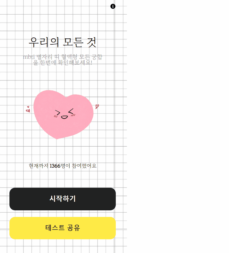 나와 상대의 별자리, mbti, 12지신, 혈액형을 입력하면 두사람의 궁합에 대해 알려주는 사이트를 만들었다.